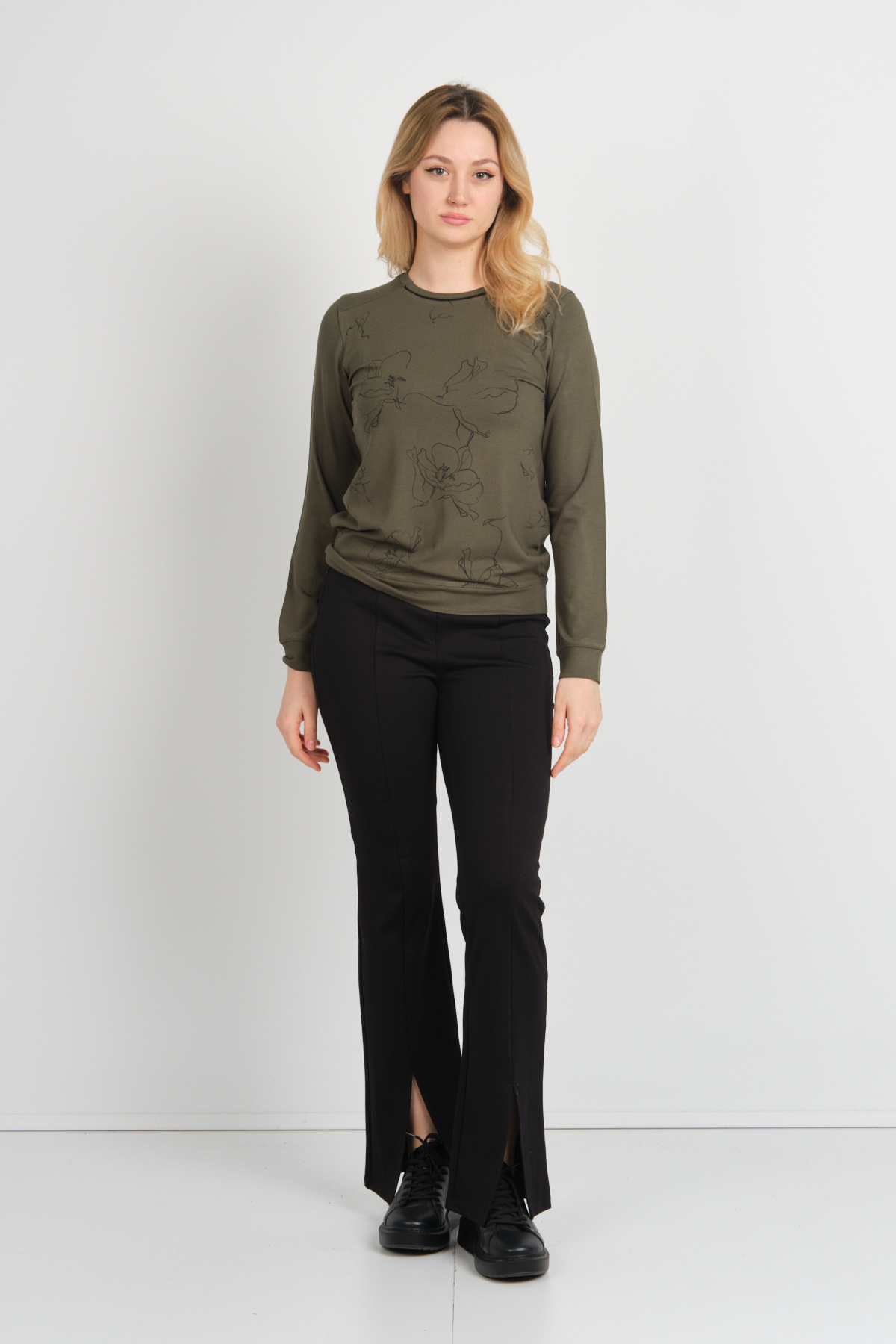 Ürün Tipi: Bluz;Kalıp Bilgisi: Tam kalıp;Materyal Bilgisi: 94% Viskon, 6% Elastan;Menşei : Türkiye (TR);Detay: Viskon kumaşıyla hafif ve konforlu bir kullanım sunan uzun kollu bisiklet yaka bluz, desenli yapısıyla dinamik ve şık bir görünüm oluşturur. Nefes alabilir yapısı sayesinde gün boyu rahatlık sağlarken, zarif desenleriyle hem günlük kombinlerde hem de özel davetlerde stil sahibi bir tercih sunar. Modern tasarımı ve özenle hazırlanmış detaylarıyla zamansız bir şıklık arayanlar için ideal bir seçimdir;Model Ölçüleri(cm) : Boy - 175, Göğüs - 94, Bel - 72, Kalça –99 / Kilo: 64 Kg;Manken Üzerindeki Beden: S beden;Ürün Boyu(cm): 60;