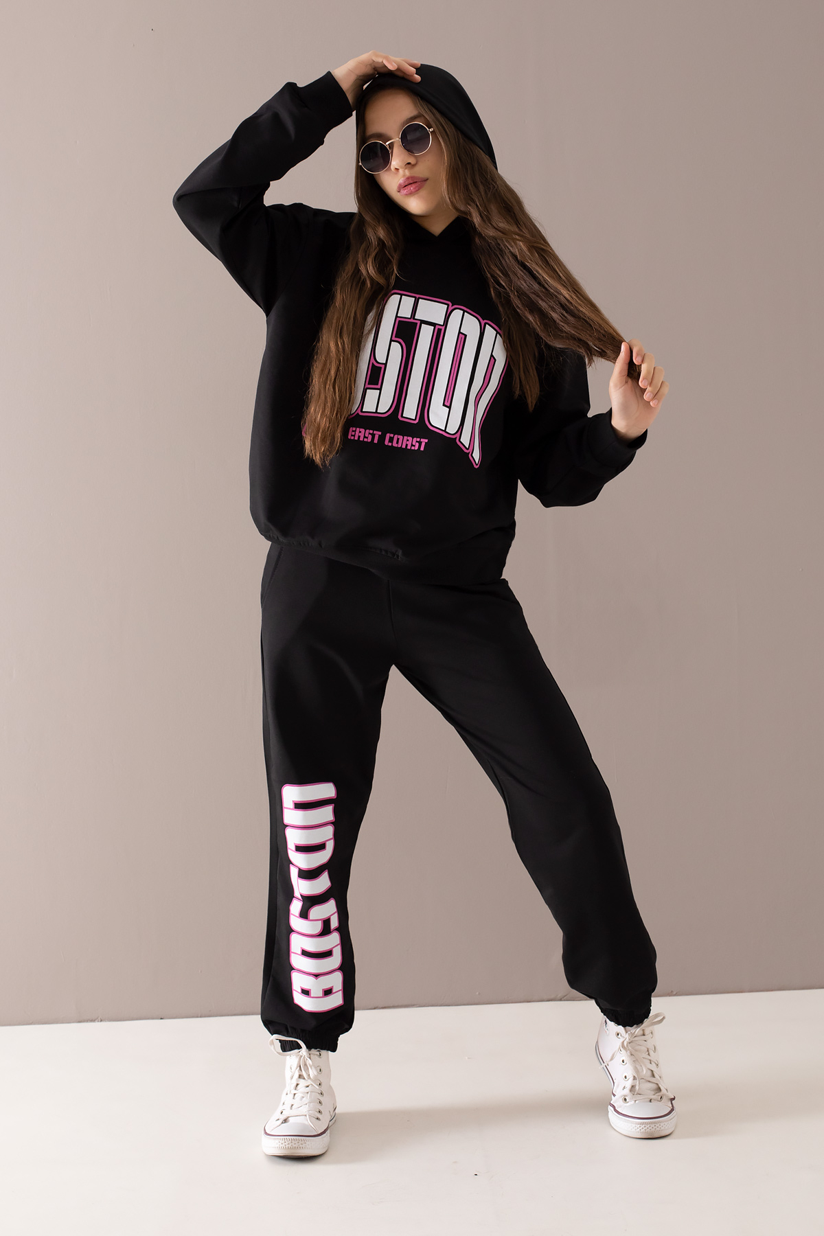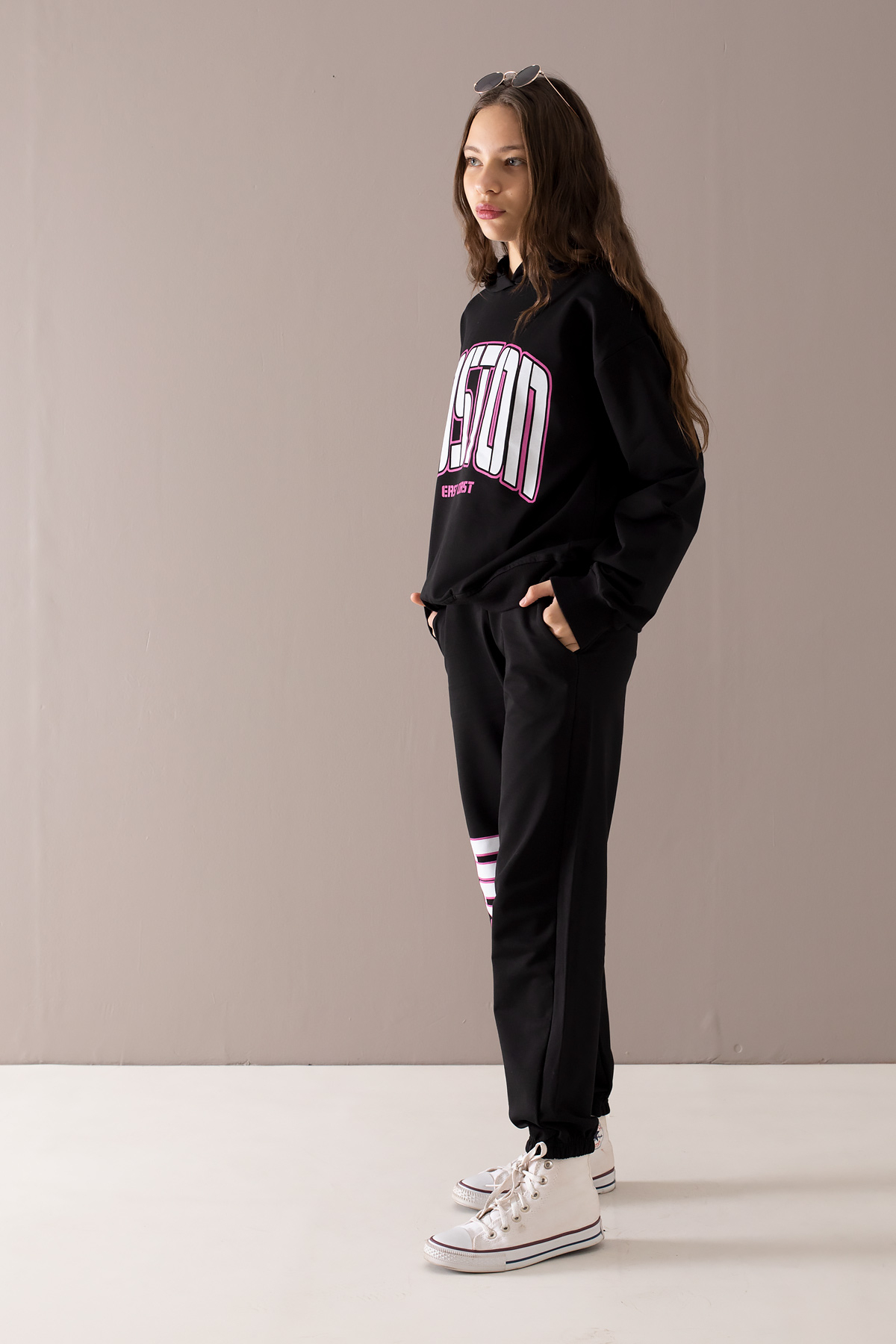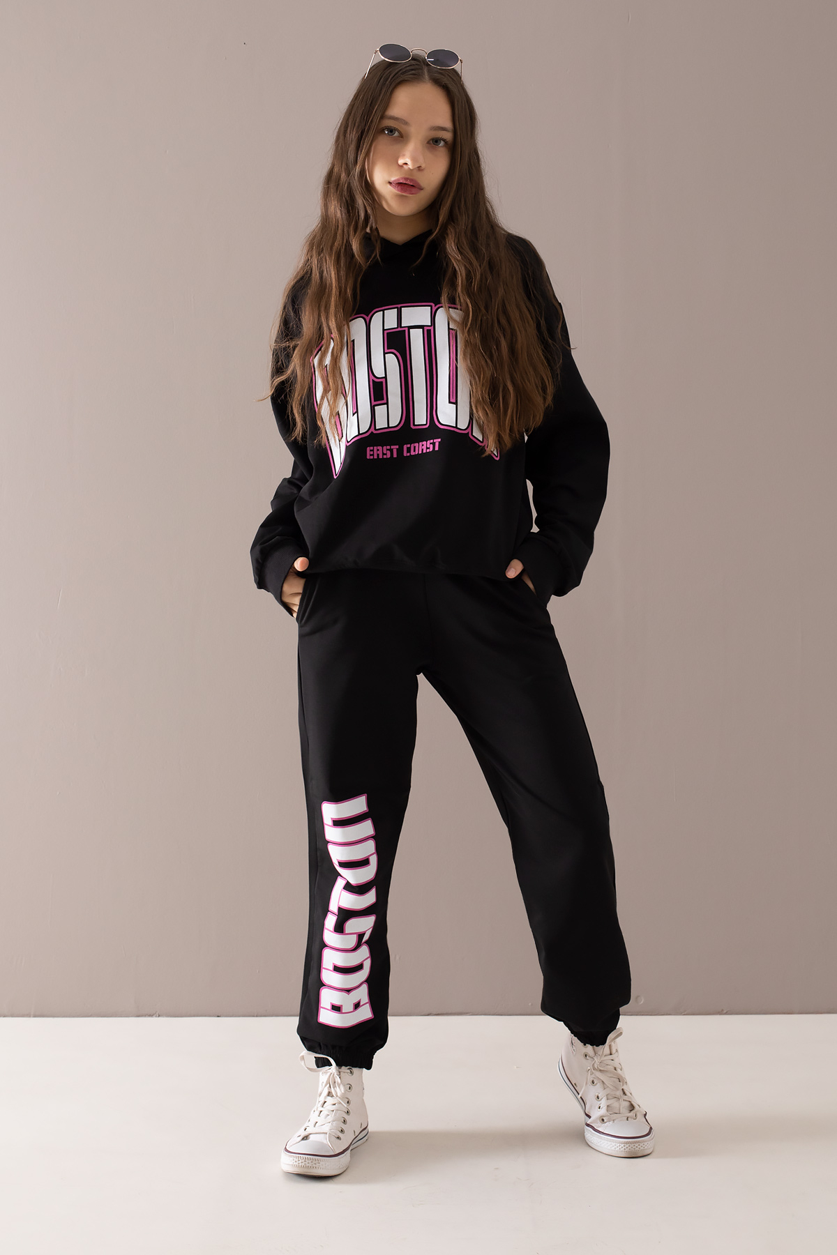 Kumaş İçeriği: %95 Pamuk %5 Elastan İçeriklidir. Türkiye'de Üretilmiştir. Göğsü Boston Yazılı Kapüşonlu Sweatshirt ve Tek Alttan Oluşan Kız Çocuk Eşofman Takımı. 40 Derecede Elde ve Makinede Yıkanabilir.
