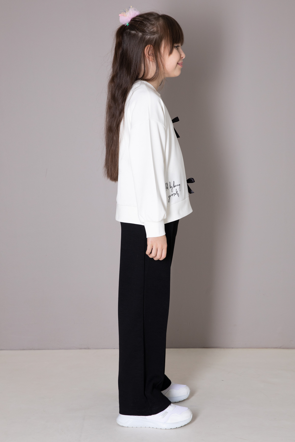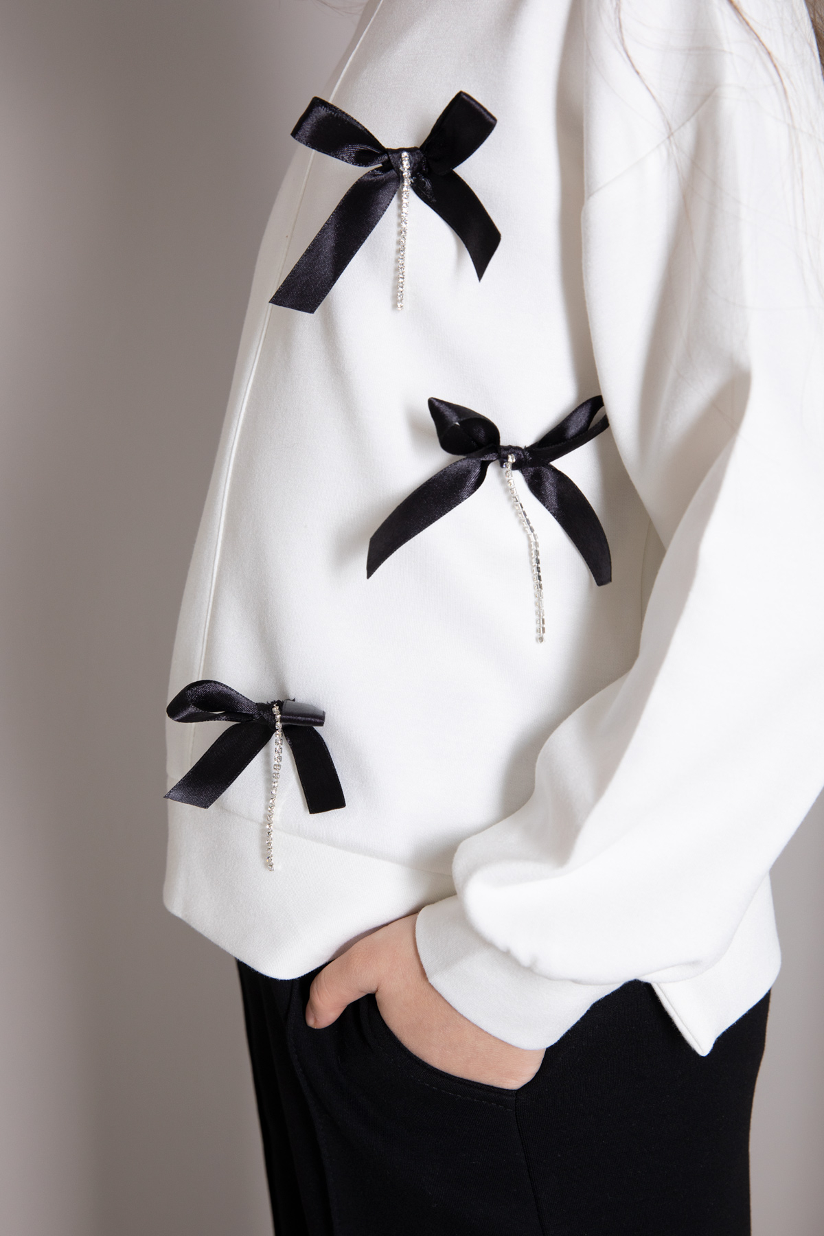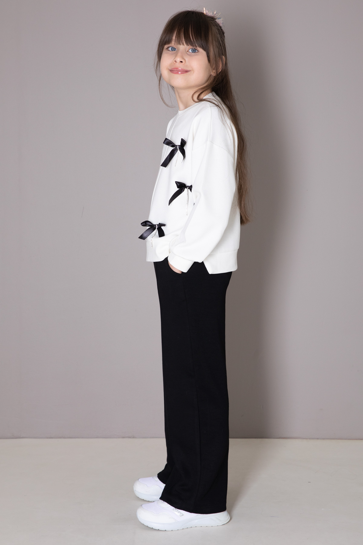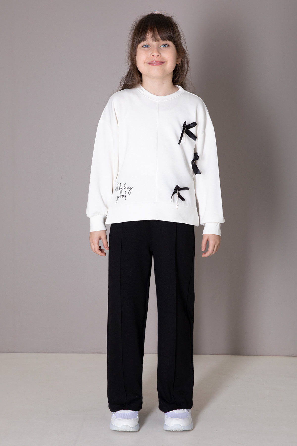 Kumaş İçeriği: %80 Pamuk %15 Polyester %5 Likra İçeriklidir. Türkiye'de Üretilmiştir. Taş Detaylı Fiyonk Nakışlı Uzun Kol Sweatshirt ve Çimalı Geniş Paça Esnek Bel Pantolondan Oluşan Kız Çocuk Takım Modeli. Maximum 30 Derece Sıcaklıkta Yıkayınız. Ağartıcı Kullanmayınız. Orta Sıcaklıkta Ütüleyiniz. Kuru Temizleme Önerilmez. Tamburlu Kurutma Uygulanmaz.