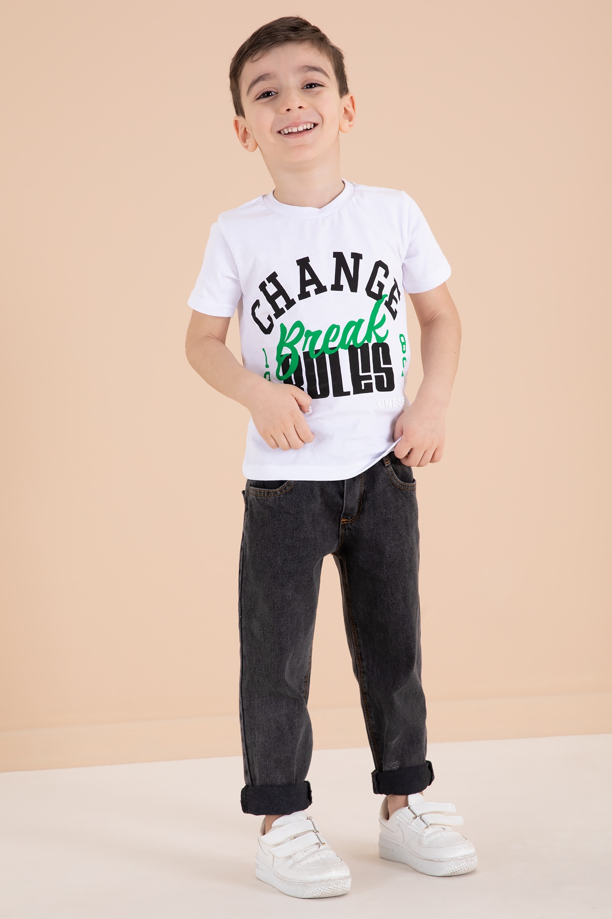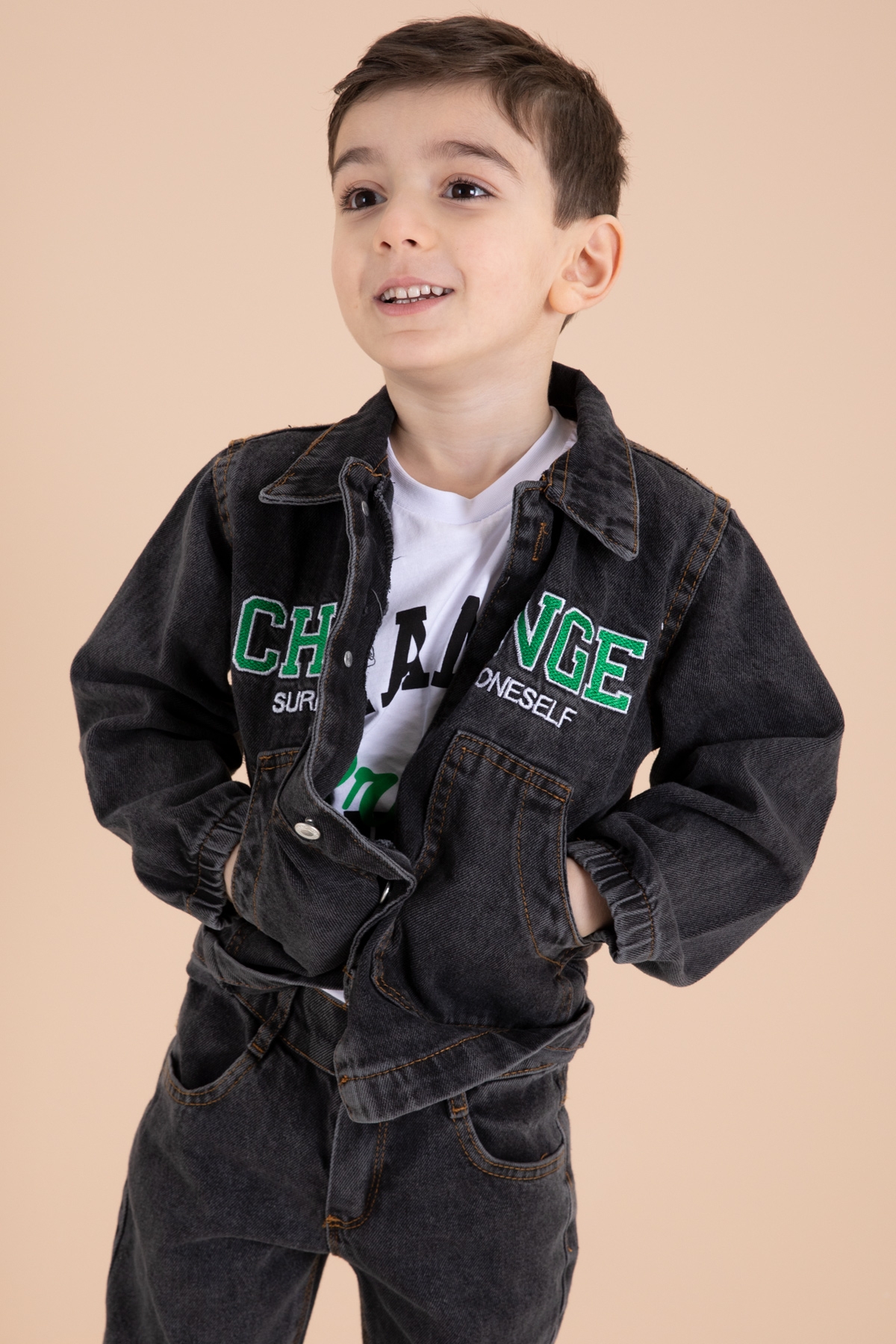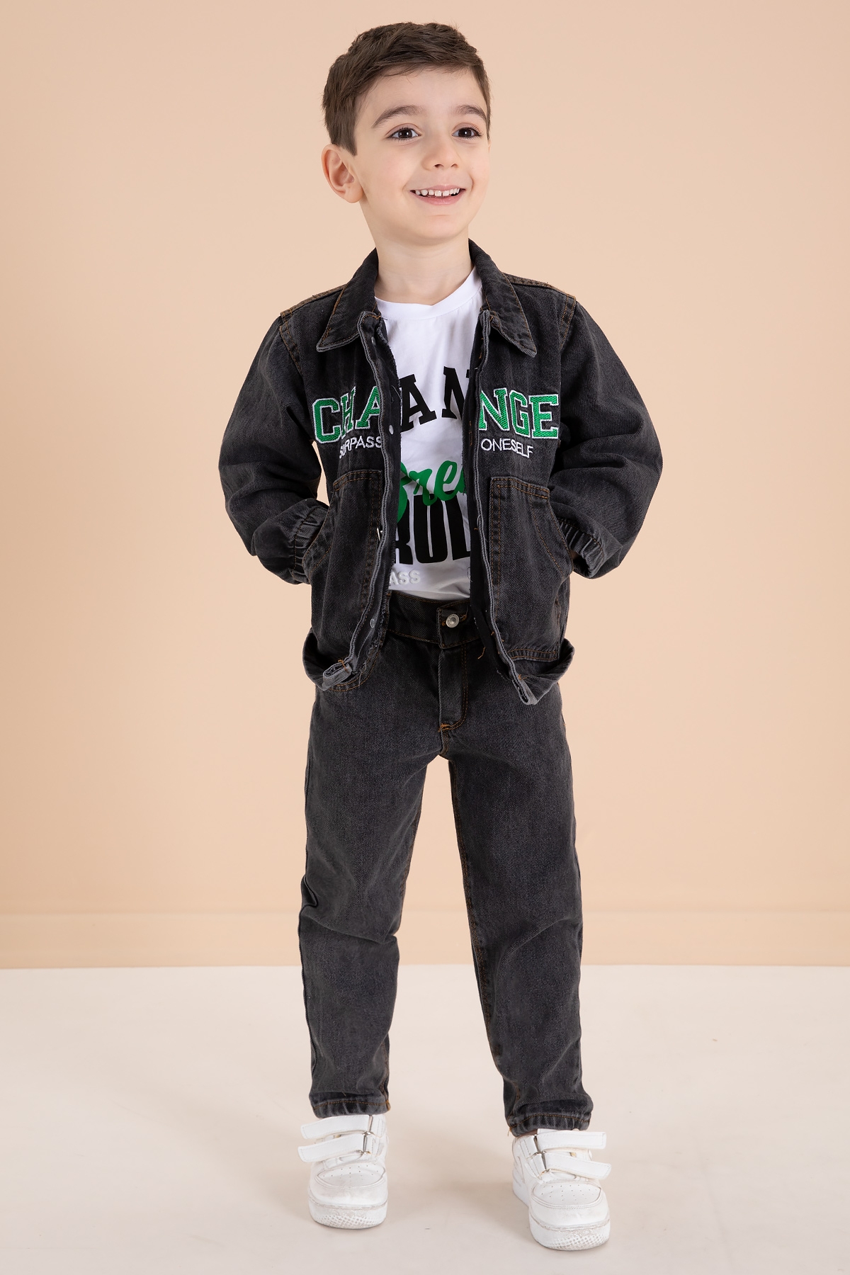 Kumaş İçeriği: %100 Cotton Kumaştır. Türkiye'de Üretilmiştir. Yazı Nakışlı 2 Adet Cebe Sahip Ceket, Jean Pantolon ve Bisiklet Yaka T-shirtten Oluşan Erkek Çocuk 3lü Jean Takım.