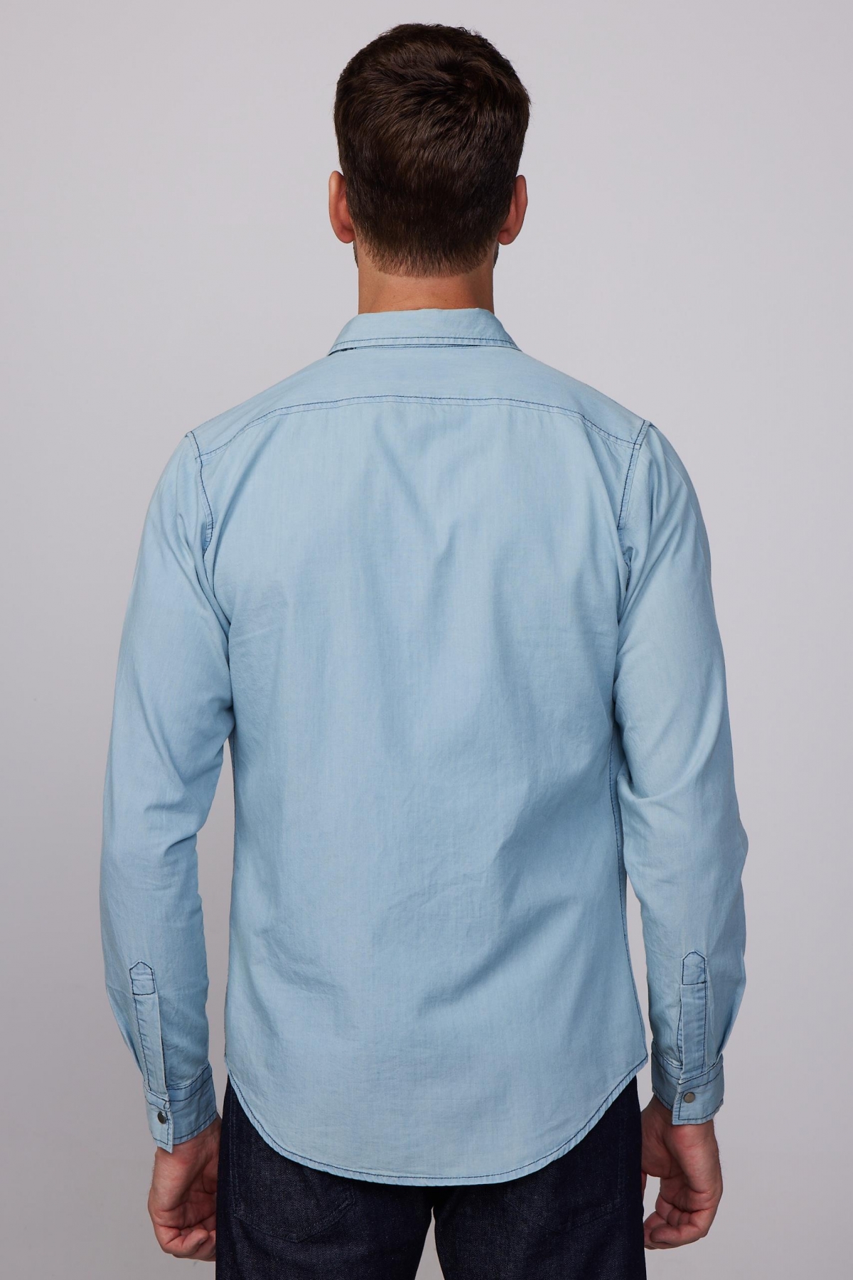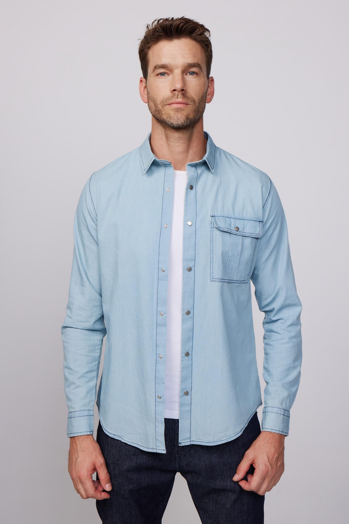 Slim Fit Uzun Kol Çıt Çıtlı Tek Cep Kapaklı Denim Mavi Erkek Gömlek