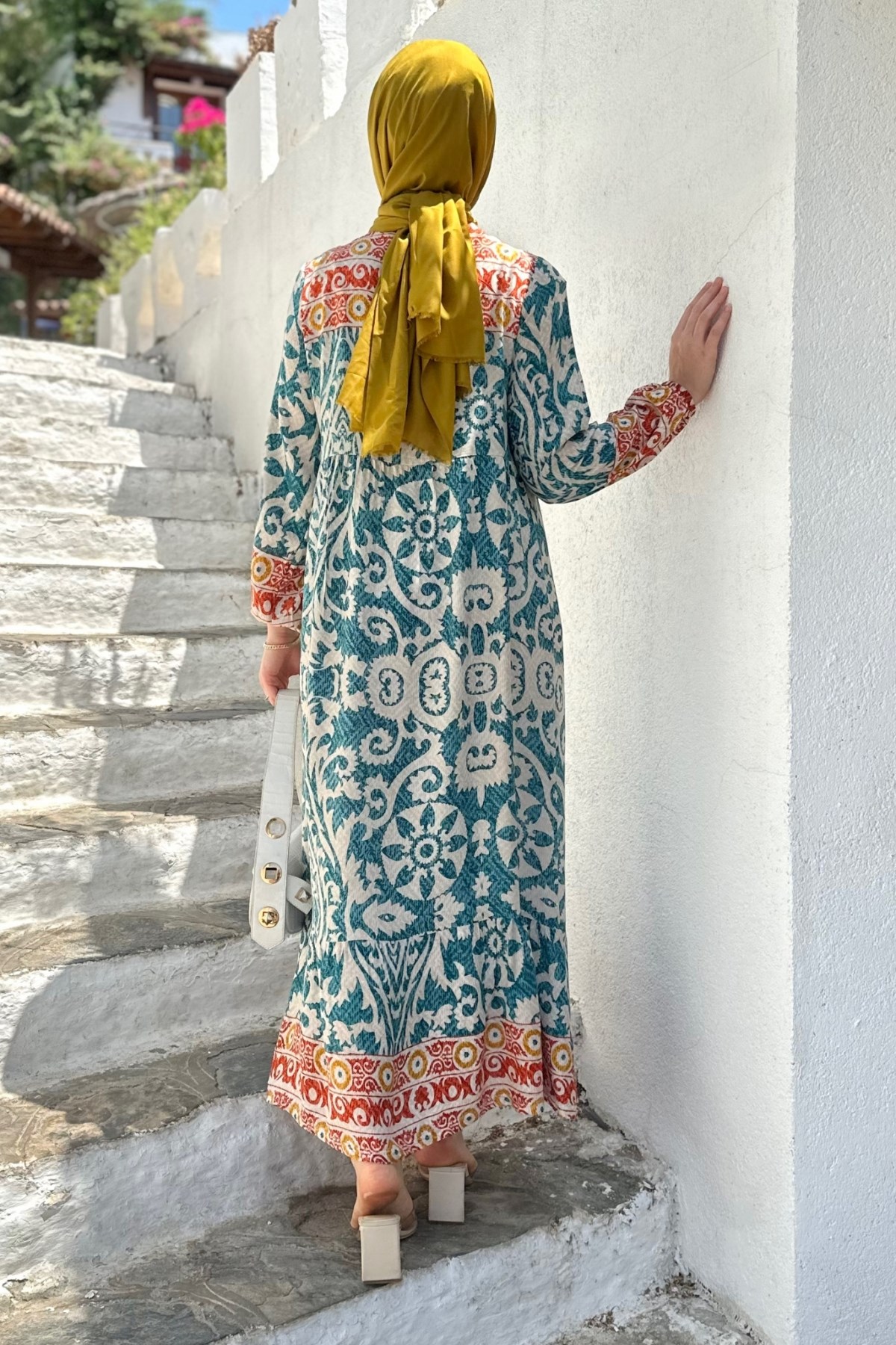 AnasayfaGiyimElbiseGünlük elbiseSophia kadın turkuaz trend rahat günlük yaka bağlama detaylı viscon elbise sophia-7518