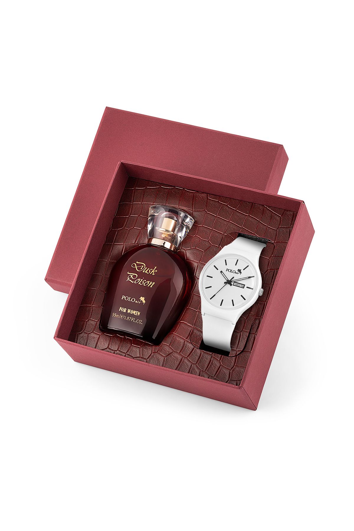 GÖRSELDE GÖRÜLDÜĞÜ GİBİ PARFÜM SAAT İLE BİRLİKTE HEDİYELİK ÖZEL KUTUSUNDA POLO AİR LOGOLU VE HEDİYE PAKETİNDE GÖNDERİLMEKTEDİR # SET İÇERİĞİ # 1 -Adet POLO AİR KADIN KOL SAATİ 1-Adet POLO AİR KADIN PARFÜM ( 55 ML ) 1-Adet POLO AİR GARANTİ BELGESİ 1-Adet POLO AİR GÖRSELDEKİ HEDİYELİK KUTUSU # Saat Özellikleri # 2 yıl makine garantisi vardır.; Garanti belgesi ürün kutusunda imzalı ve kaşeli olarak yer almaktadır.; Suya Dayanıklı Değildir.; Takvim özelliklidir.; # Parfüm İçeriği (55 ml) # Üst Notalar ; Armut,Mandalina,Litchi,Kırmızı Elma.; Orta Notalar ; Gardenya,Bezelye,Yasemin,Frezya,Manolya.; Alt Notalar ; Vanilya,Benzoin,Misk,Pralin,Kehribar,Sandal Ağacı.; # Kutu Ölçüsü #15x 15x 6 cm - Zarif tasarımıyla dikkat çeken bu kadın kol saati, bordo renkli parfüm ile birlikte sunulur.; - 26-30 mm kasa çapına sahip olan bu saat, hem şık hem de rahat bir kullanım sağlar.; - Beyaz kasa rengi ve siyah detaylarıyla modern bir görünüm sergiler.; - Quartz mekanizması ile zamanı hassas ve doğru bir şekilde takip eder.; - Takvim özelliği sayesinde günlük planlarınızı kolayca yönetebilirsiniz.;