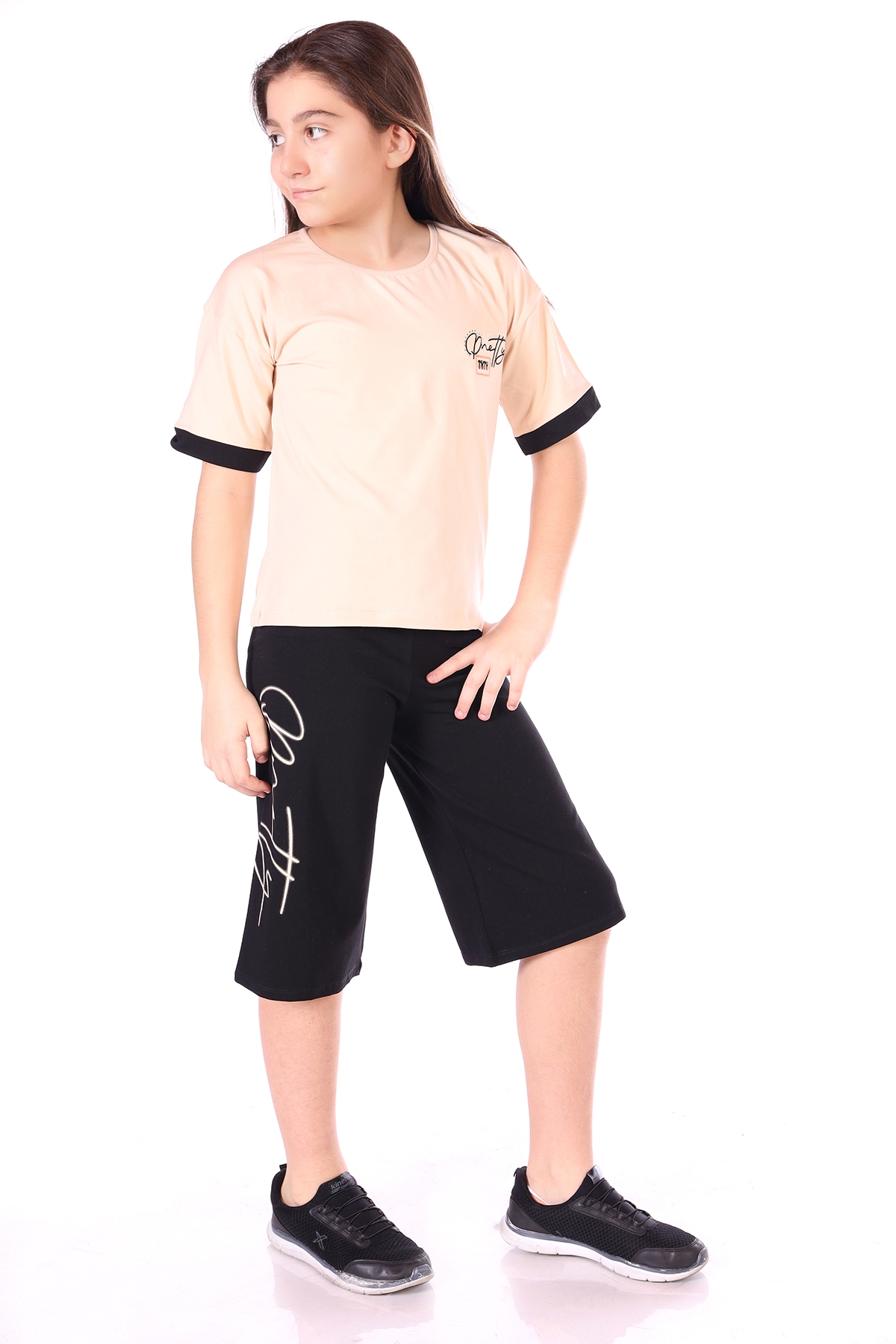 Tişört İçeriği Bisiklet yakadır. Düşük koldur. Kapri İçeriği Kordonludur. Bol paçadır. Kumaş Özellikleri %94 Pamuk %6 Elastan'dan üretilmiştir. Yıkama talimatı: ürünlerimizi daha uzun süre kullanabilmeniz için, lütfen yıkama, kurutma ve ütüleme işlemlerini tersten yapınız. Dikkat stüdyo çekimlerinde ışık farklılığından dolayı ürün renkleri değişiklik gösterebilir.