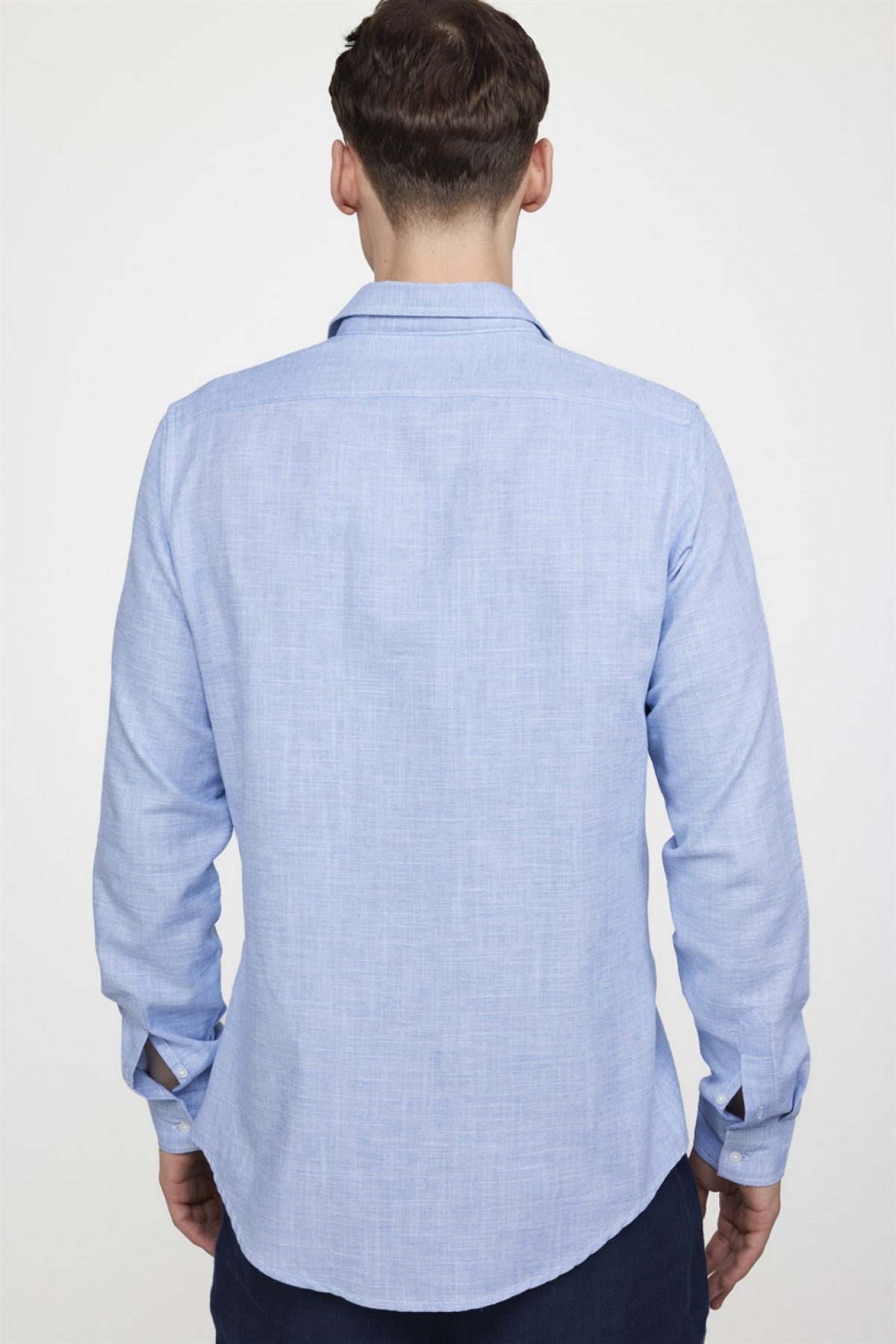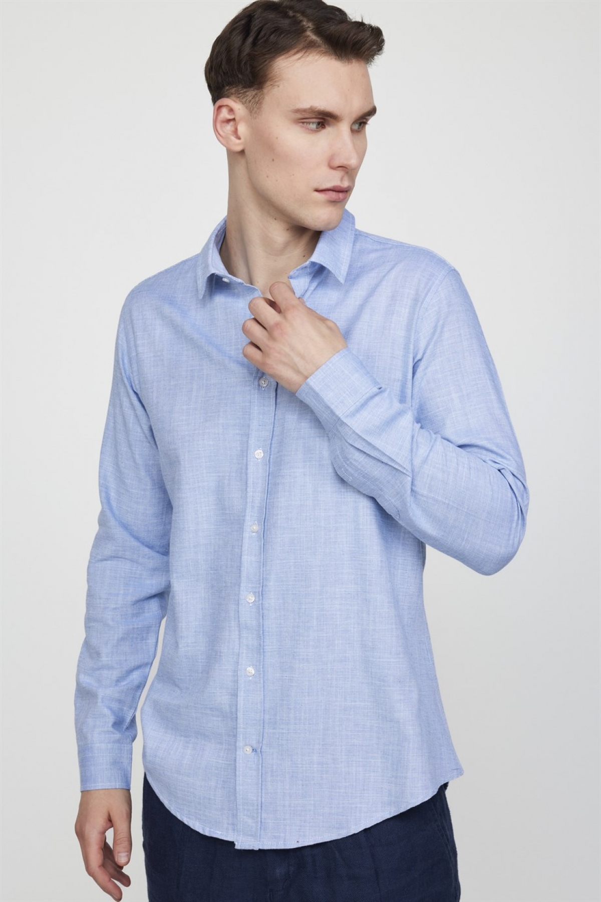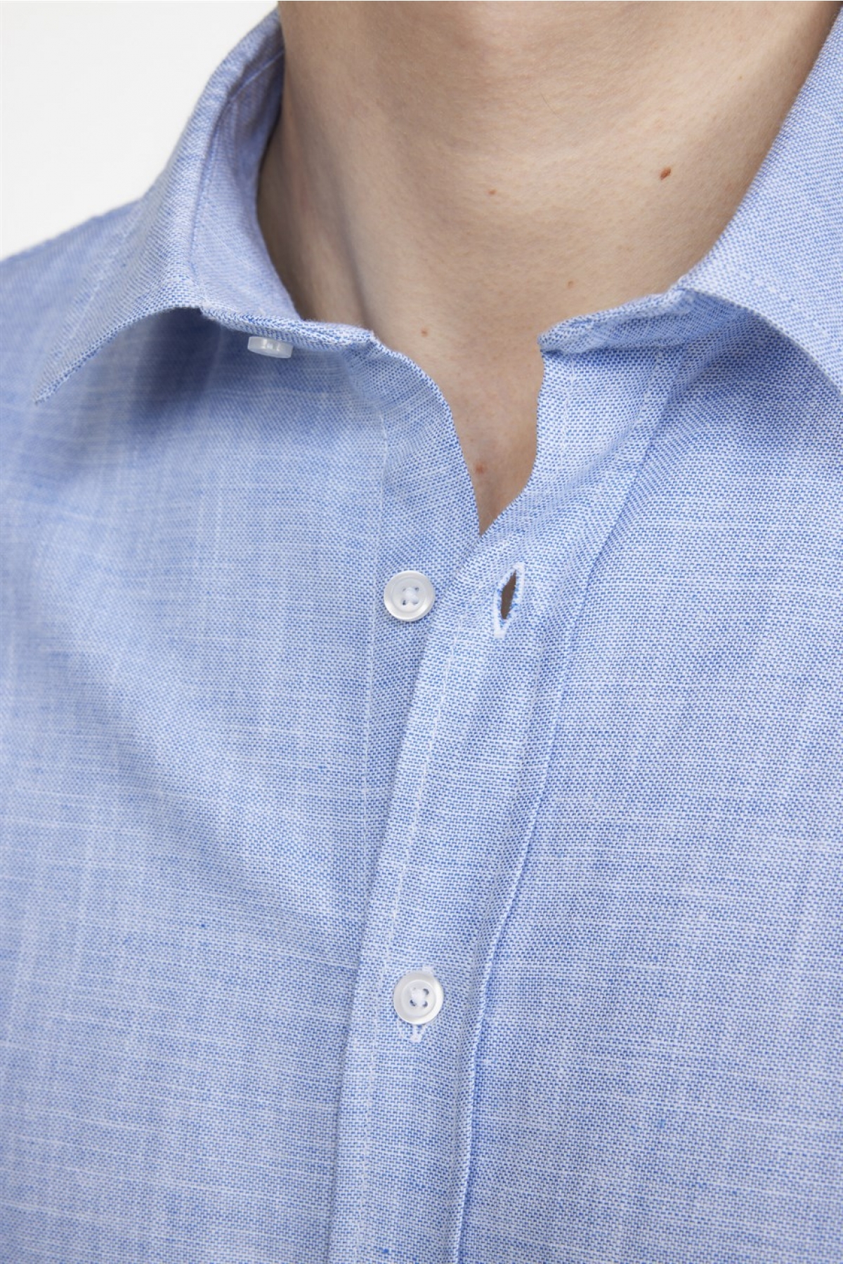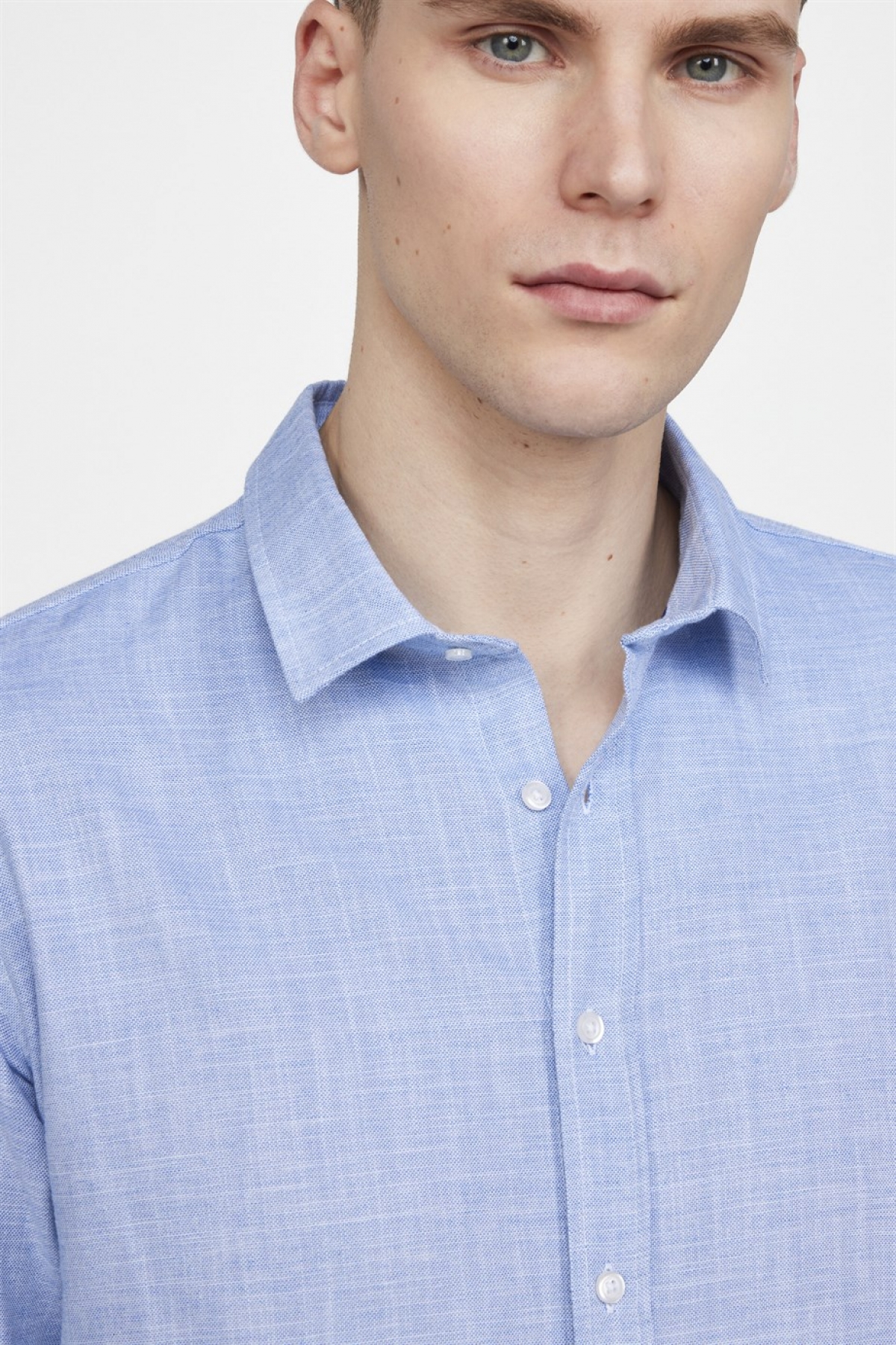 Slim Fit Uzun Kol Keten Efekt Düz Biyeli Mavi Gömlek