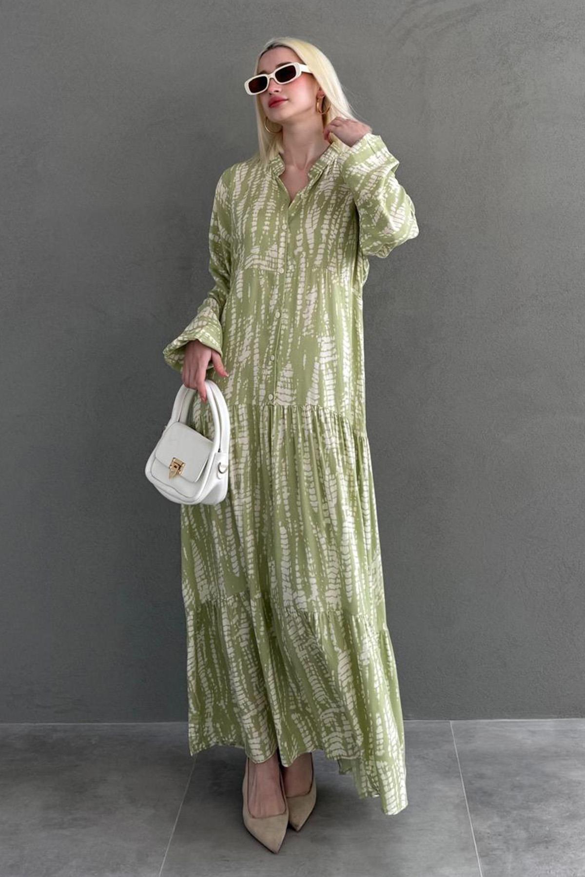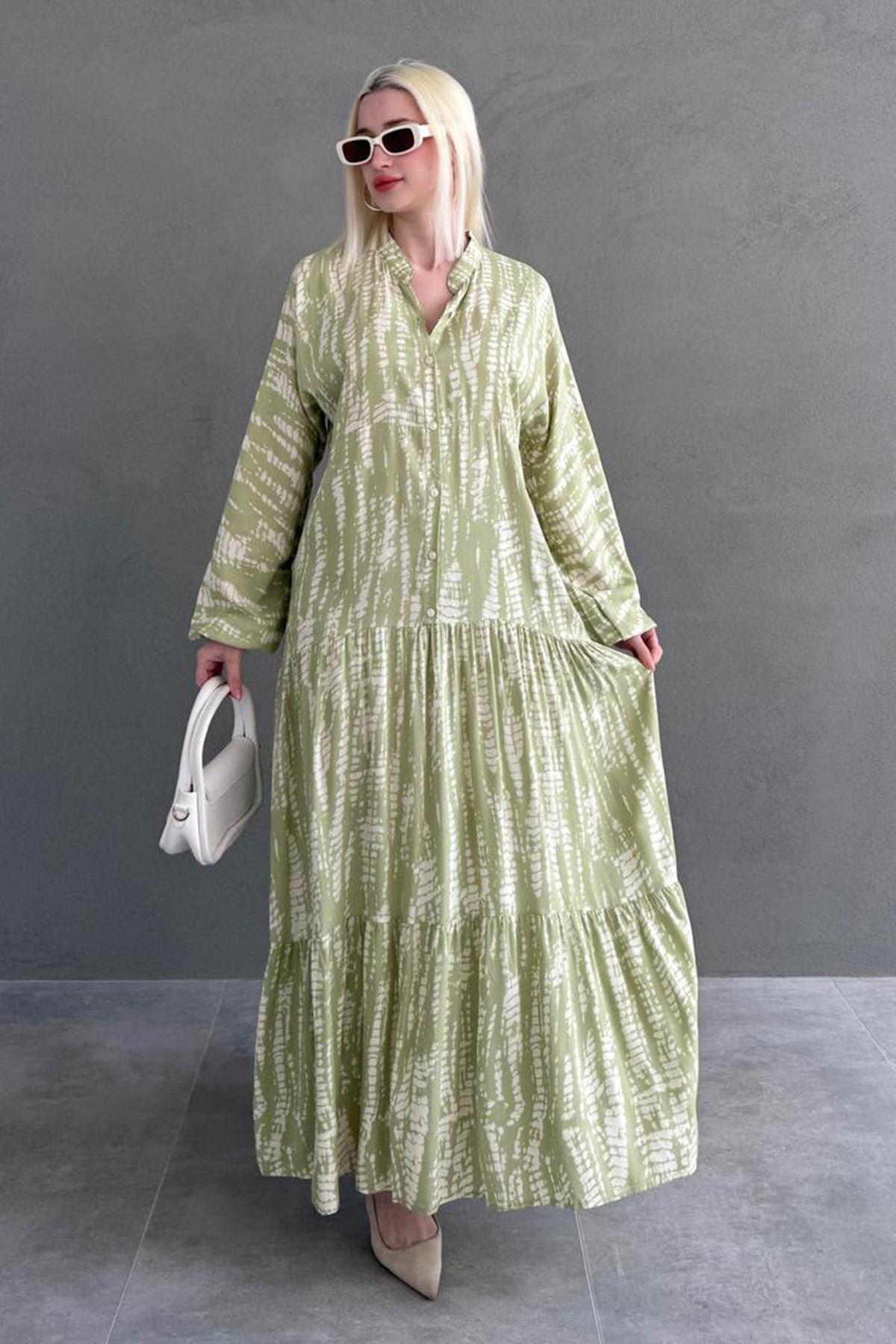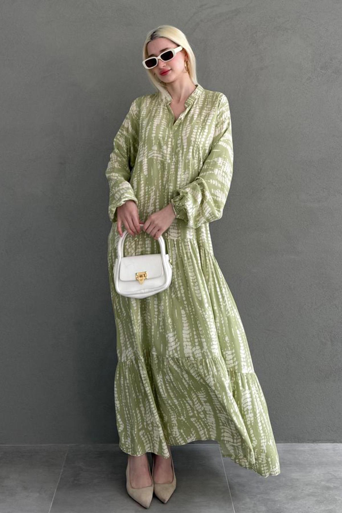 AnasayfaGiyimElbiseAbiye elbiseYeşil desenli önü düğmeli uzun kollu elbise mg2398