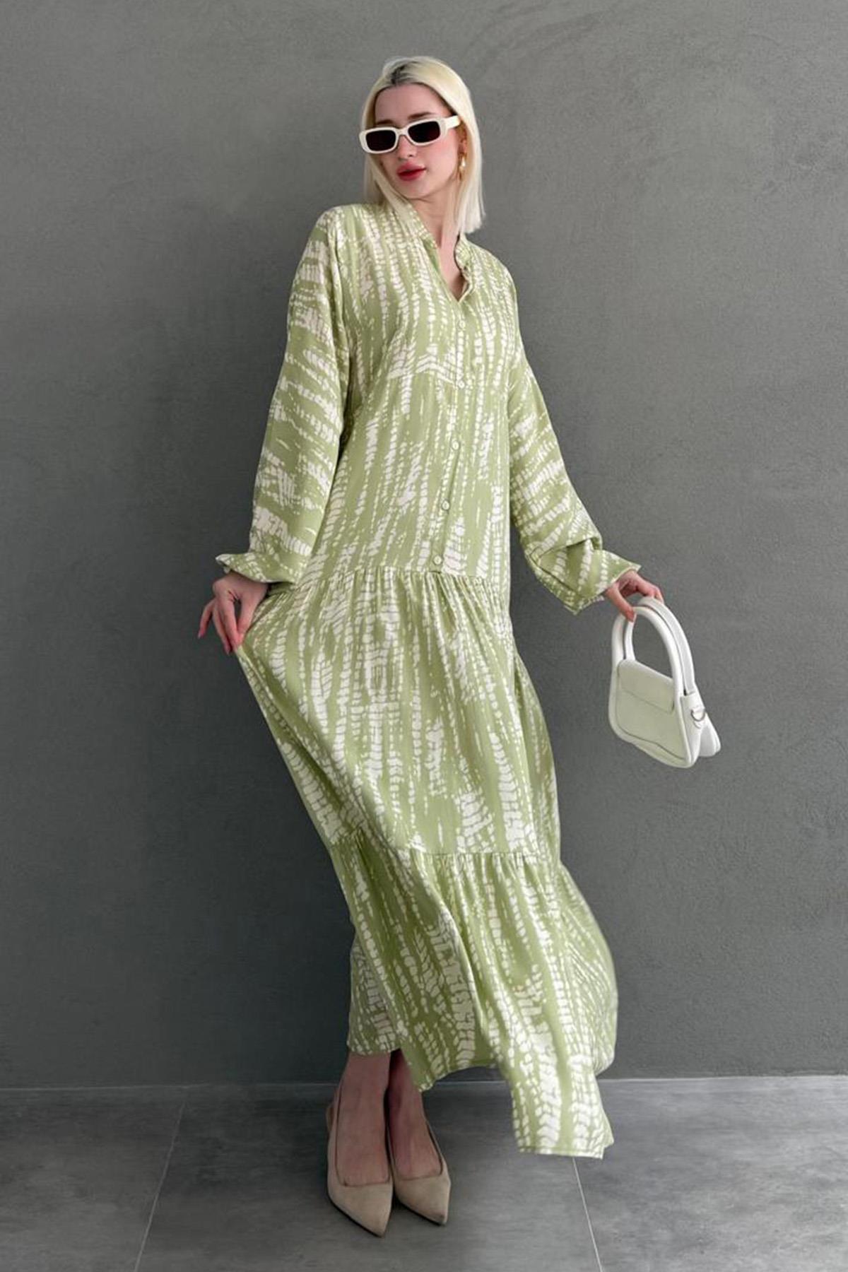 Madmext Yeşil Desenli Önü Düğmeli Uzun Kollu Elbise MG2398