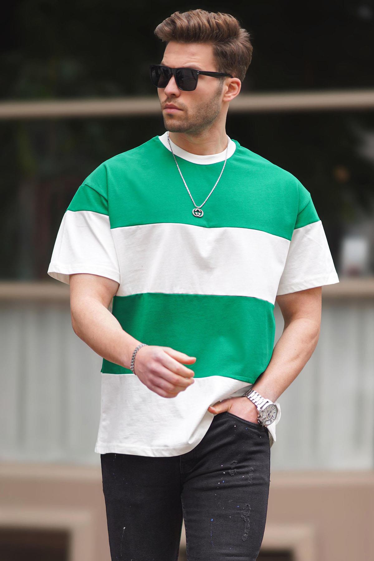 Madmext Yeşil Oversize Renk Bloklu Bisiklet Yaka Tişört 7020